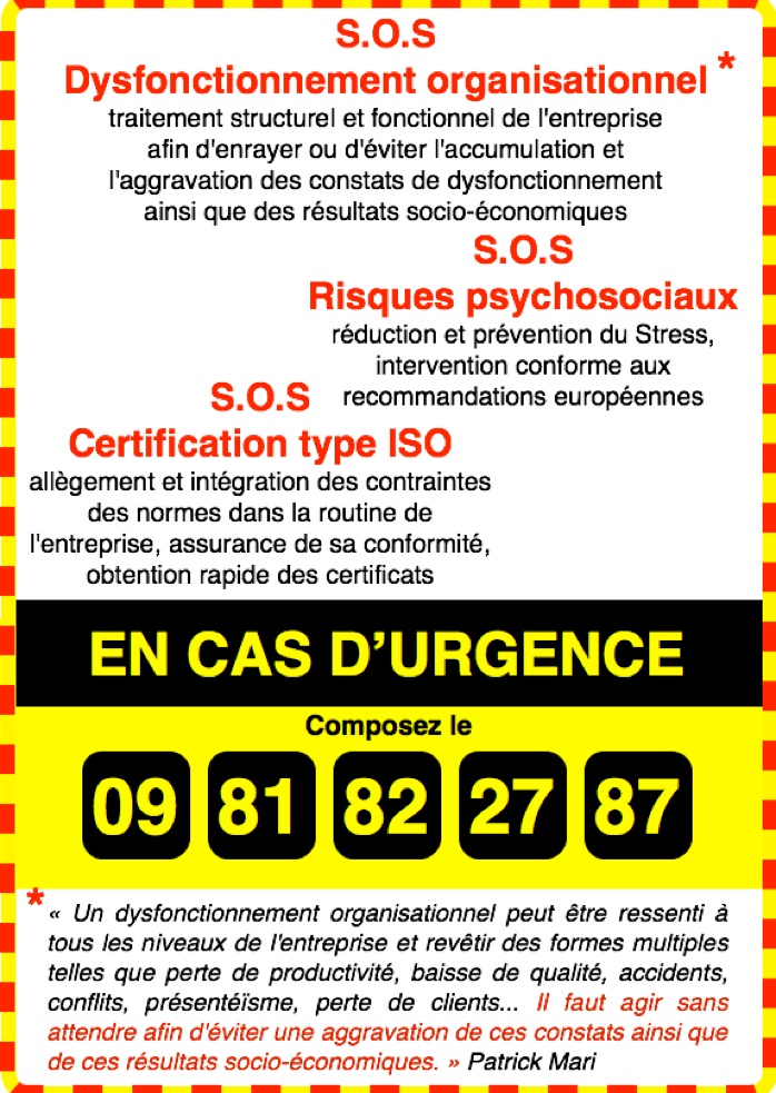 * « Un dysfonctionnement organisationnel peut être ressenti à tous les niveaux de l’entreprise et revêtir des formes multiples telles que perte de productivité, baisse de la qualité, accidents, conflits, présentéïsme, perte de client… Il faut agir sans attendre afin d’éviter une aggravation de ces constats ainsi que de ces résultats socio-économiques. » Patrick Mari